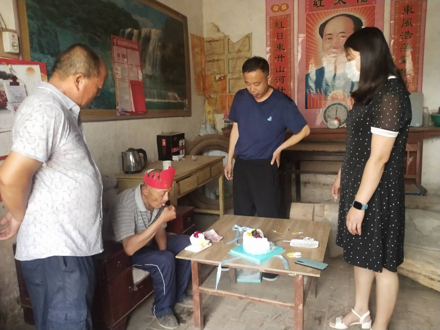 6月6日这天是孙存良60岁生日,潘甜甜 局帮扶干部黄海霞自费购买蛋糕与局派驻第一书记郝守华一同来到他的家中,与他一道欢庆生日。