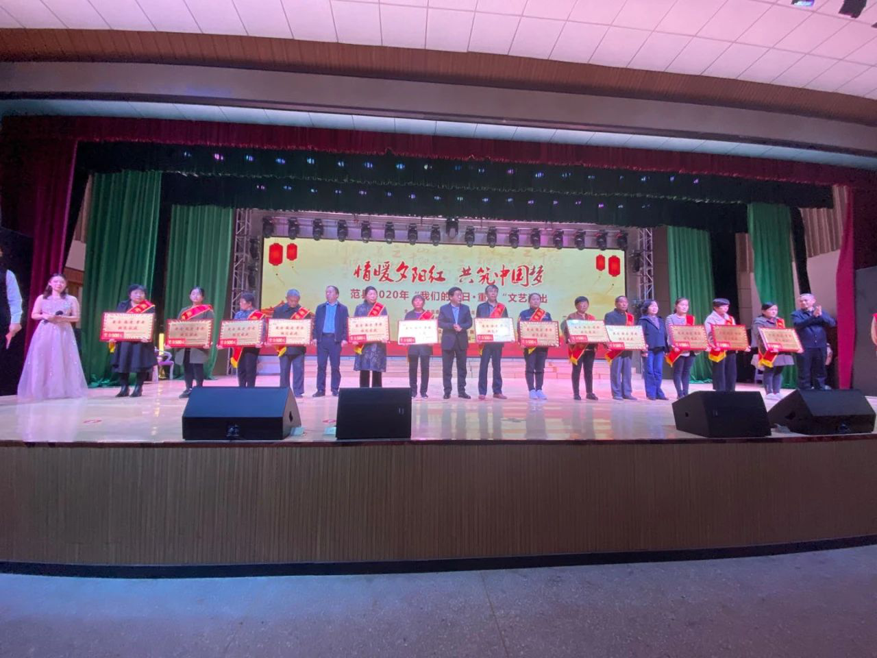 10月24日,为庆祝九九重阳节,我县还在第一小学演播厅举办了“情暖夕阳红 共筑中国梦”范县2020年“我们的节日·重阳”文艺演出活动。演出现场还为各乡(镇)推选的13个爱老、敬老、孝老模范家庭颁发了奖牌,并为每个家庭发放慰问金500元。